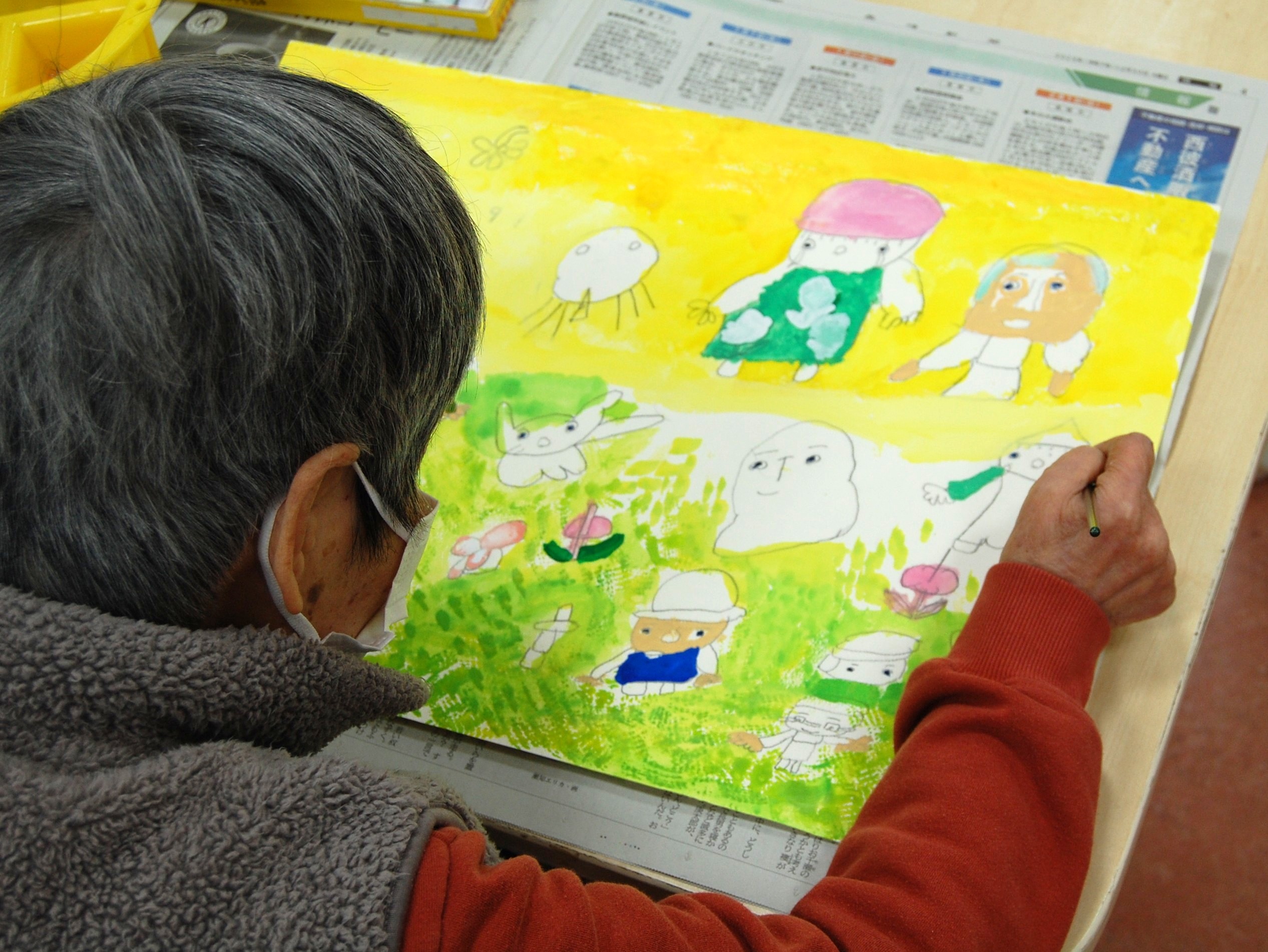 1回で作品を完成させる利用者様もいますが、多くの皆さんは回を重ねて一つを描き進めます。ゆっくりとではありますが、着実に進んでいて見る側としてワクワク感が増してきます。