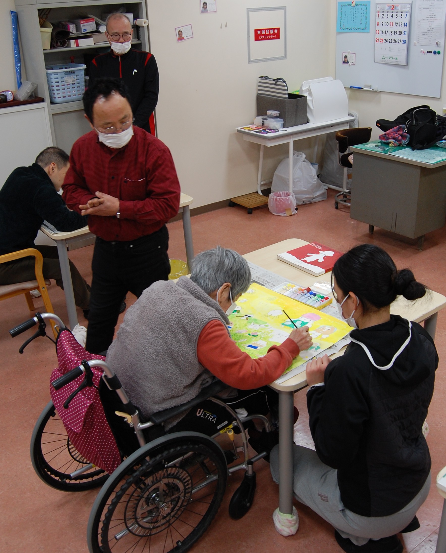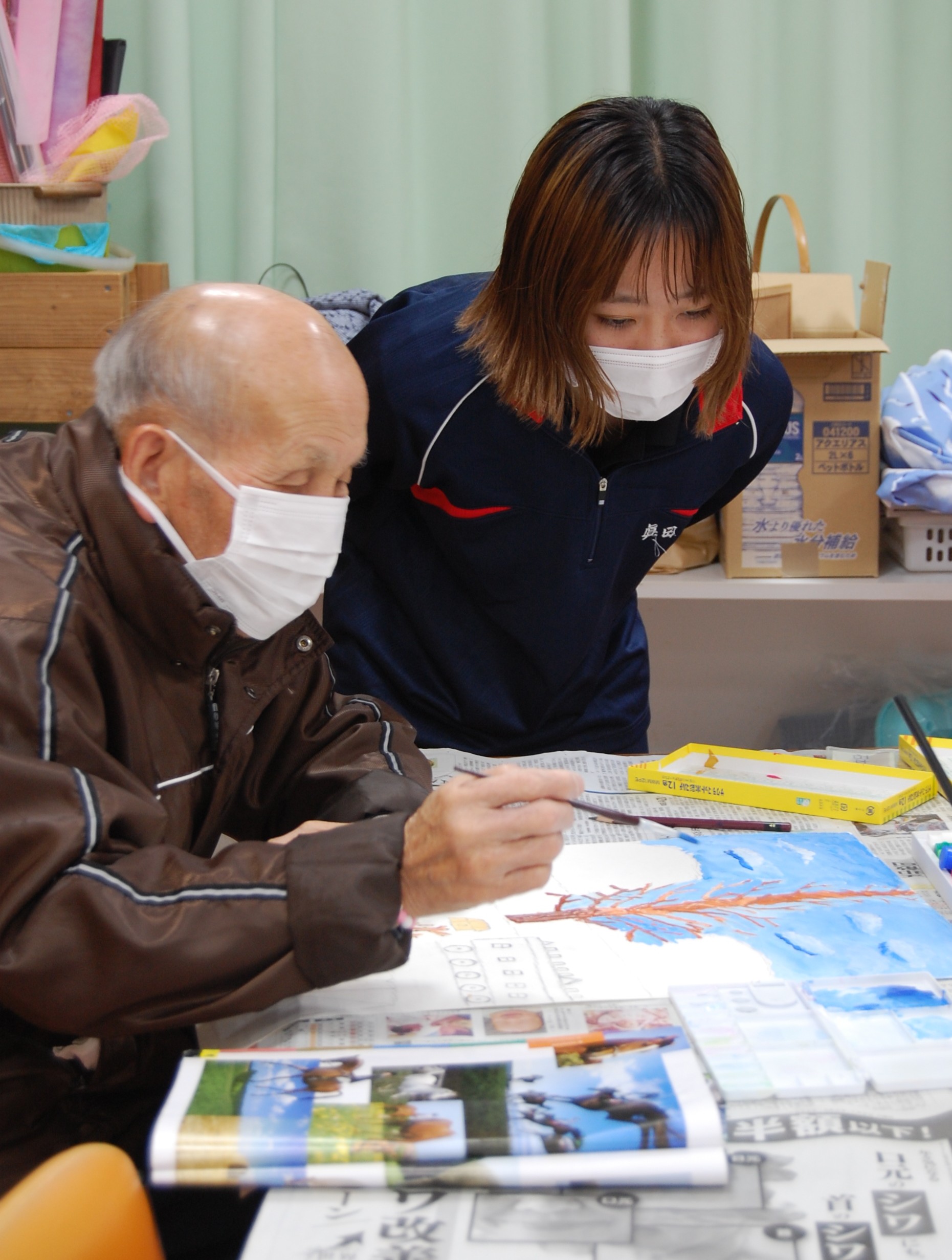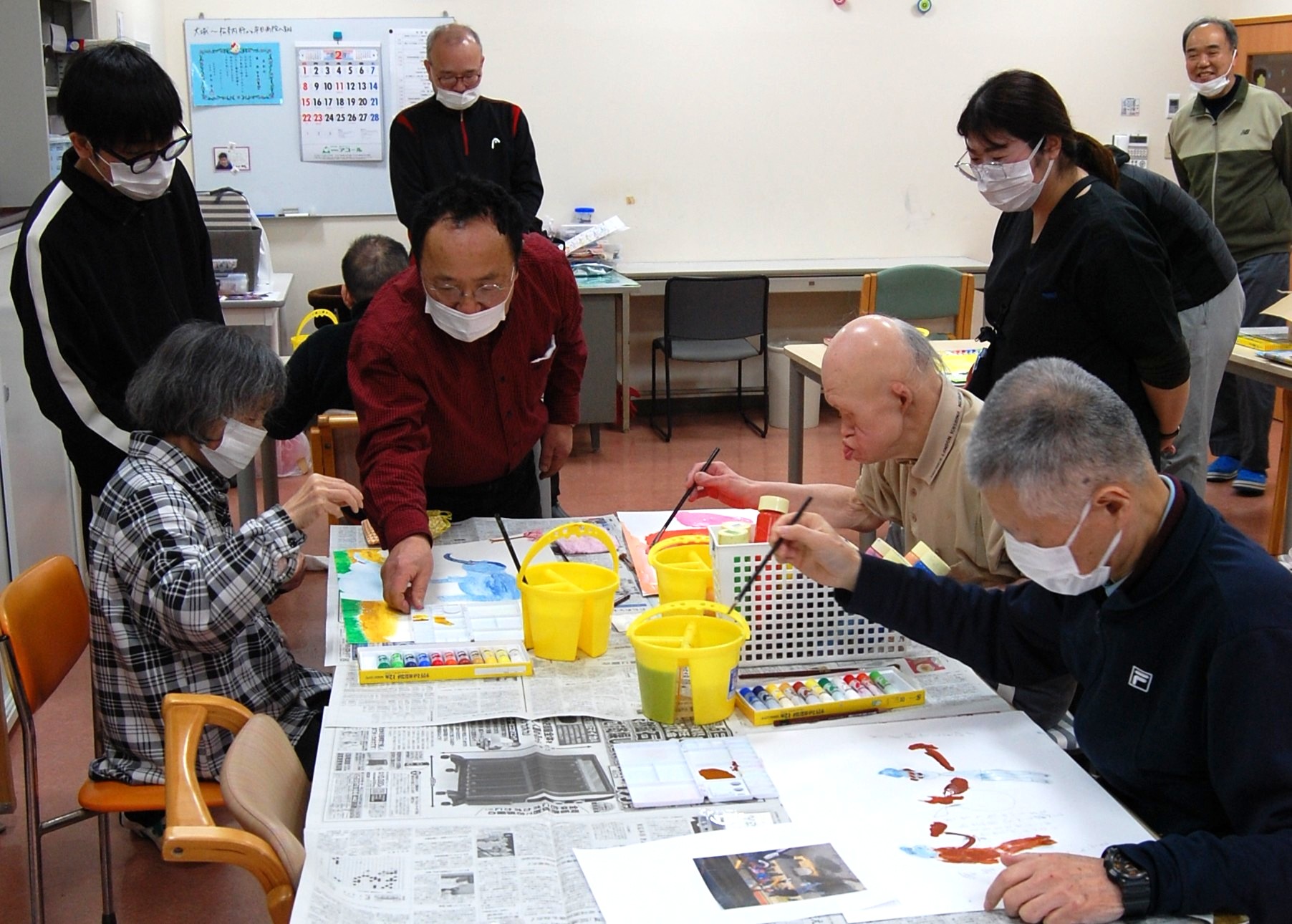 美術の教室が4日に開かれて、7人の利用者様が取り組みました。この日は、介護実習中の長崎国際大の学生さんもサポートに加わって和やかな雰囲気で進みました。