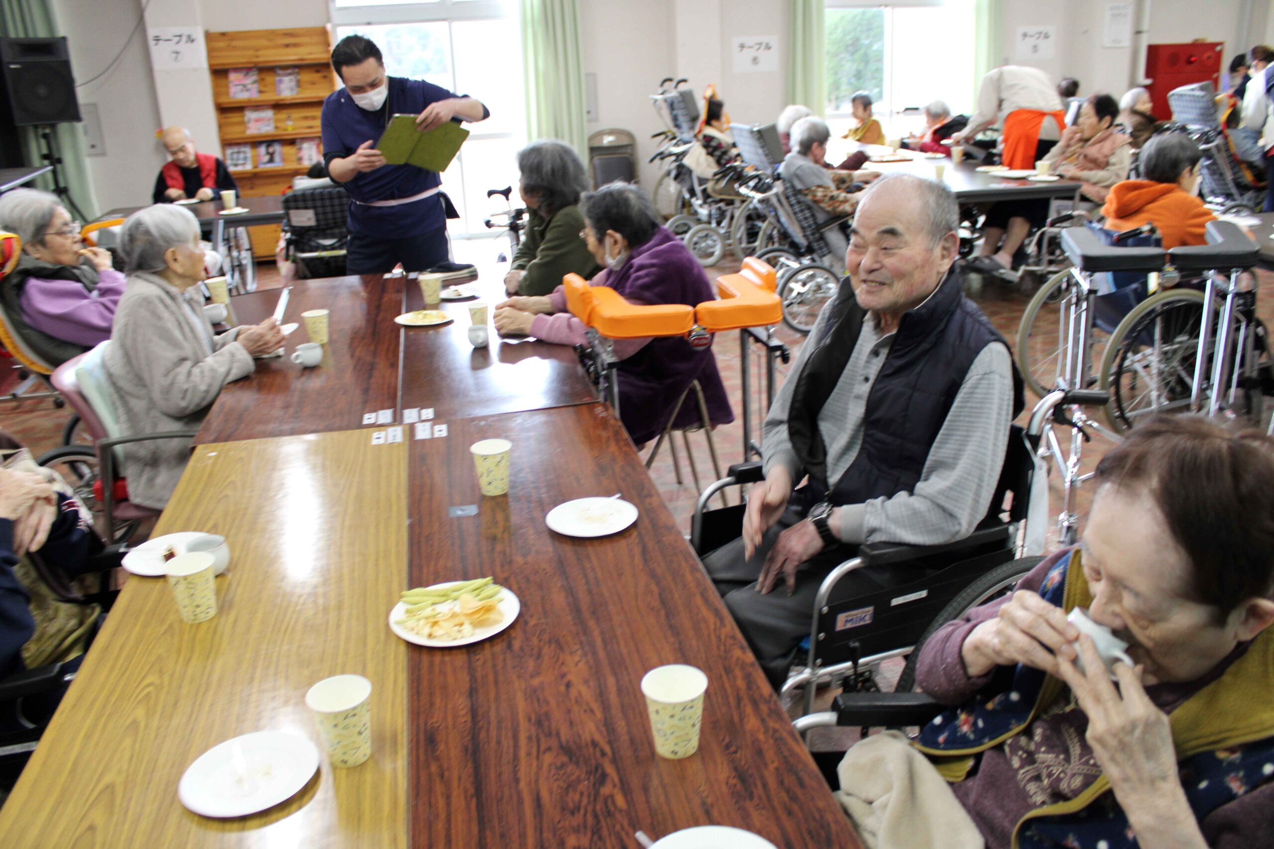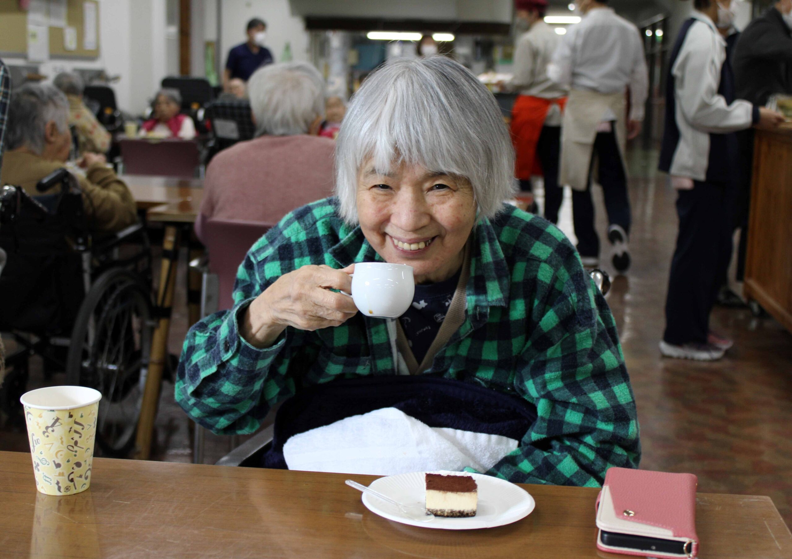 コーヒーを味わっていただく「喫茶ふくじゅ」は、昨年4月にリスタートしました。実は、かつてはこうした時間がありましたが、コロナの影響により長年中止となっていたのです。職員がドリップコーヒーを淹れて提供するこの取り組み。約70名の入所者様を半数に分け、月に2回開催、入所者様に喜ばれています。