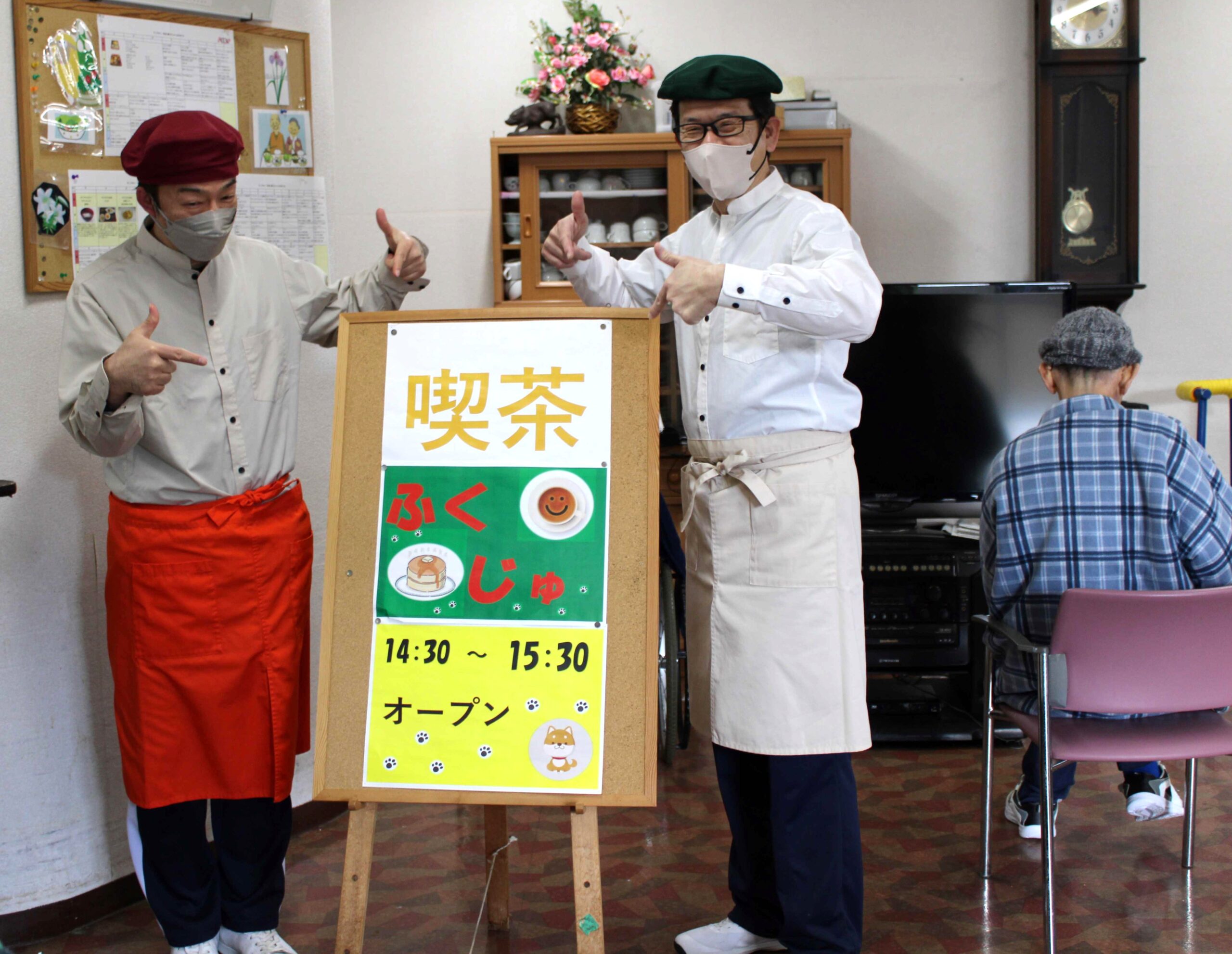 どうやったら入所者の皆さんにくつろぎの時間を提供できるか、職員と検討を重ねました。コーヒーを飲まない方にはジュース類を用意し、ケーキやお菓子も提供しています。会場にはゆったりしたジャズを流し、職員もカフェ店員に扮するなど少しずつバージョンアップをはかってきました。普段とは一味違う雰囲気作りを心掛けています。