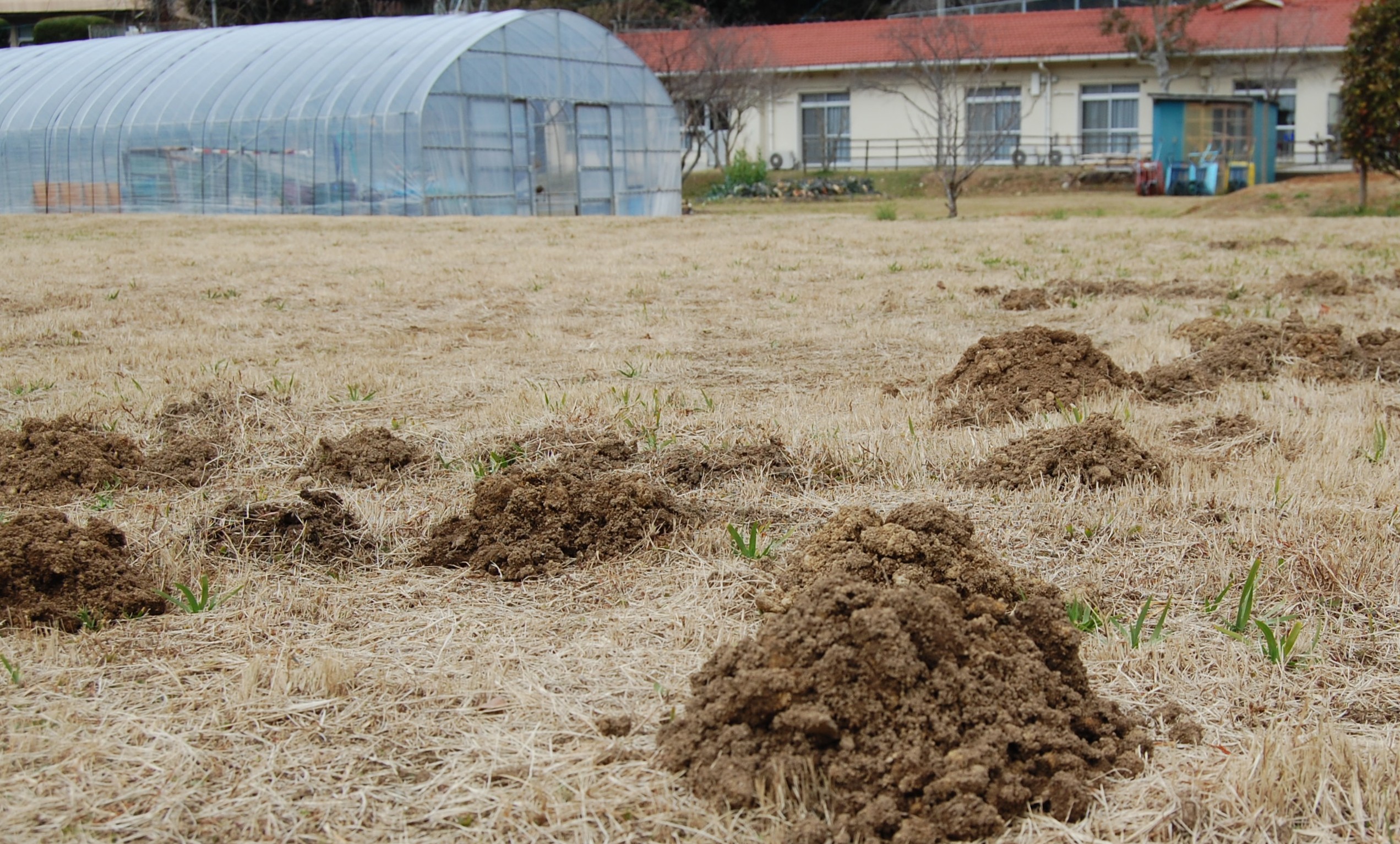 植え込みのそばや中庭に目立つのは、もぐら塚です。もぐらが土をおしあげた跡があちこちにあり、活発に活動を始めているのがわかります。この日の最高気温は14度を超えて3月上旬並みでしたが、週末はまた冷えるとの予報です。三寒四温で少しずつ冬の終わりが見えてきました。