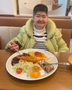 到着後、まずは皆様が心待ちにされていた昼食の時間です。「オムライスが食べたい」というお一人と、「海鮮が食べたい」というお二人の願いを叶えるメニューをそれぞれ注文。運ばれてきた料理を前に、皆様じっと見つめたり、一口ずつゆっくりと運んだりと、それぞれのペースで美味しそうに味わっておられました。