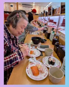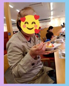 外出に先立ち、まずは佐世保五番街で買い物を楽しみ、昼食はスシローにてお寿司をいただきました。久しぶりの外食に、皆様それぞれ嬉しそうな表情を見せてくださいました。