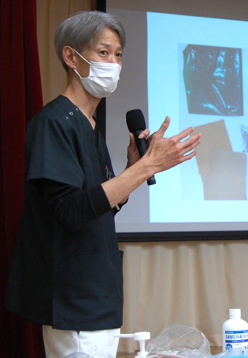 福本氏は、症状やウイルスごとの特徴を説明したあと、感染した場合に施設側に求められる注意点、対策について多くの時間をさきました。嘔吐物処理については、実際に園でどのような装具を備えているかを確認して、具体的にアドバイスしました。