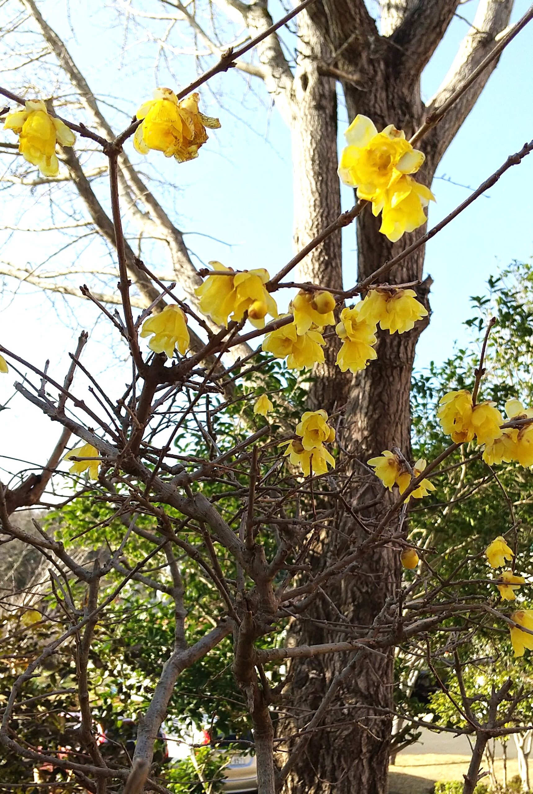玄関前の梅がほころびました。まだちらほらとだけですが、冷気の中で凛と咲いています。隣にあるロウバイも開いて、鮮やかな色が目を引いています。