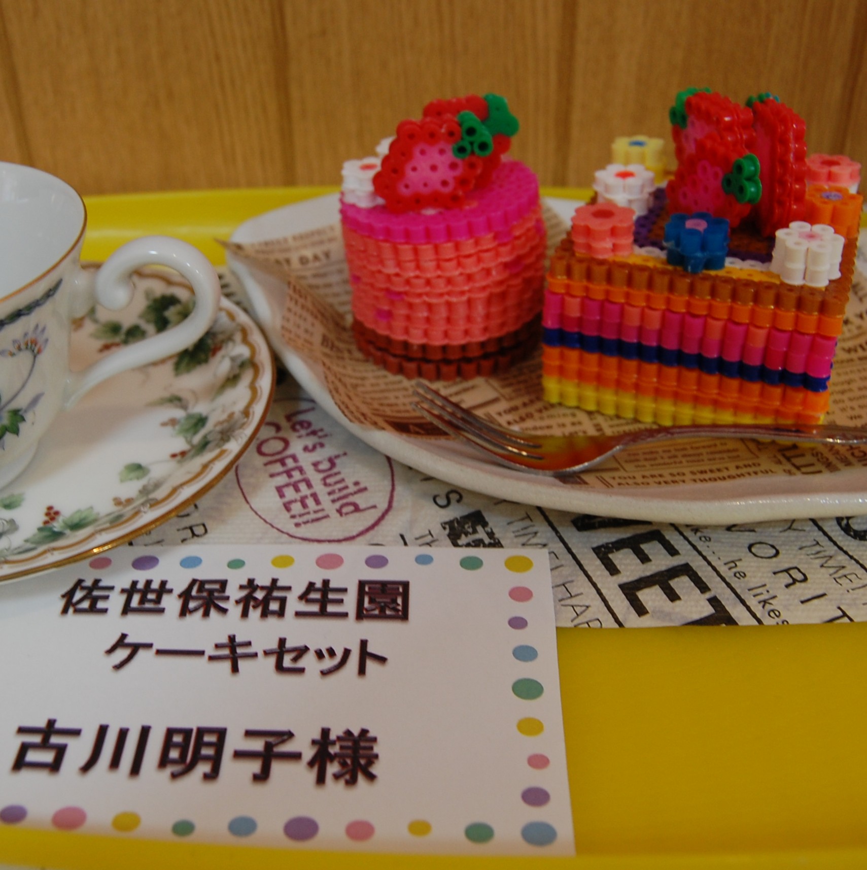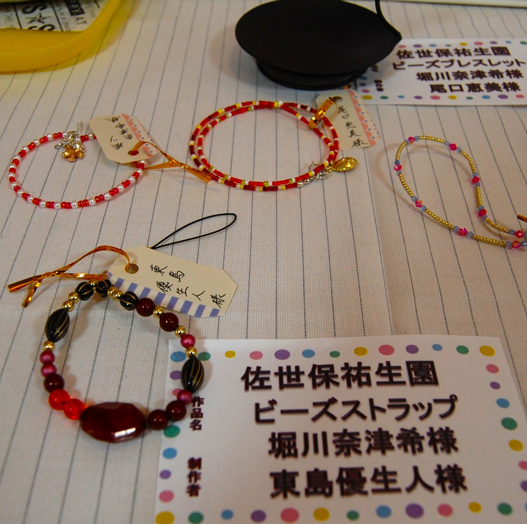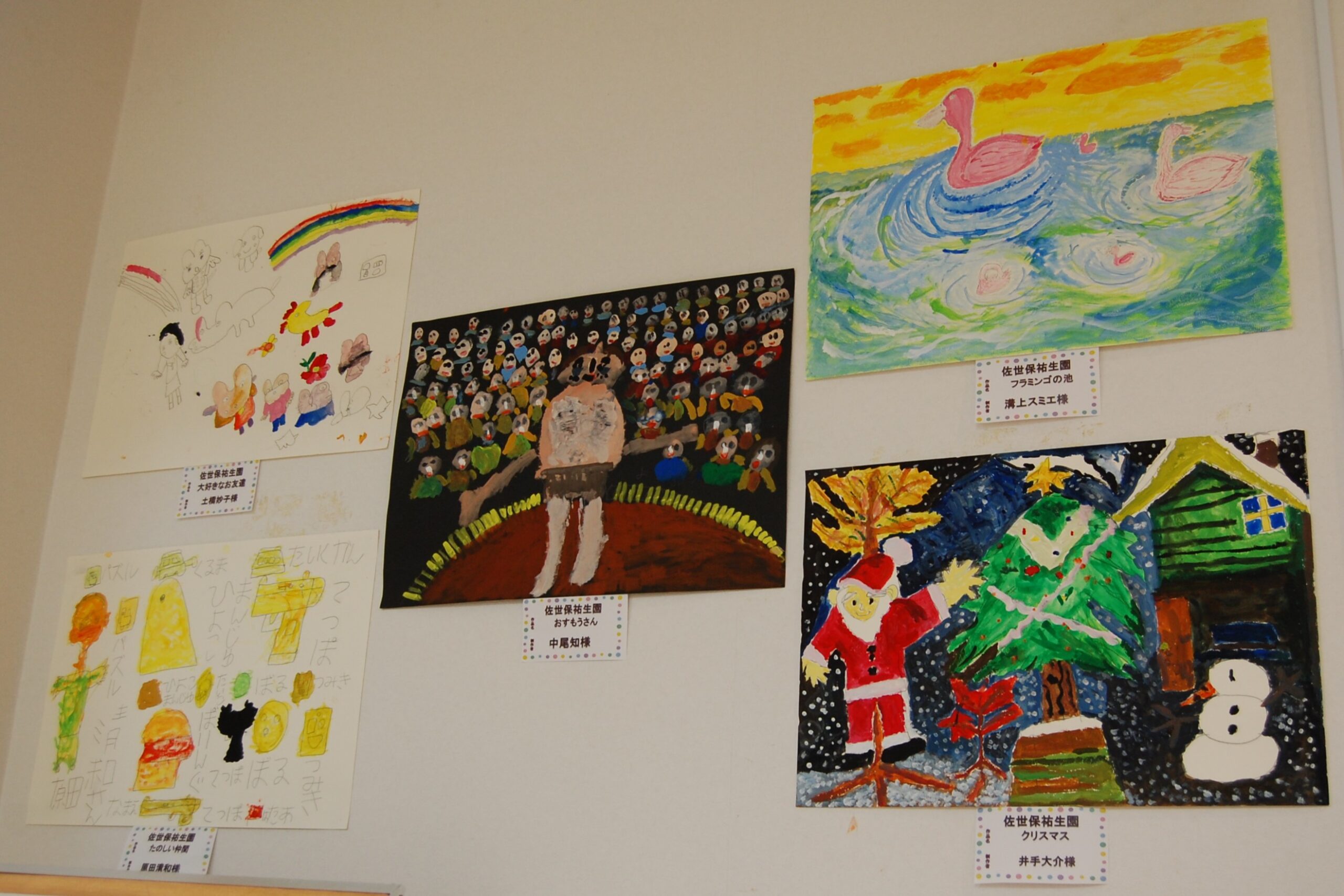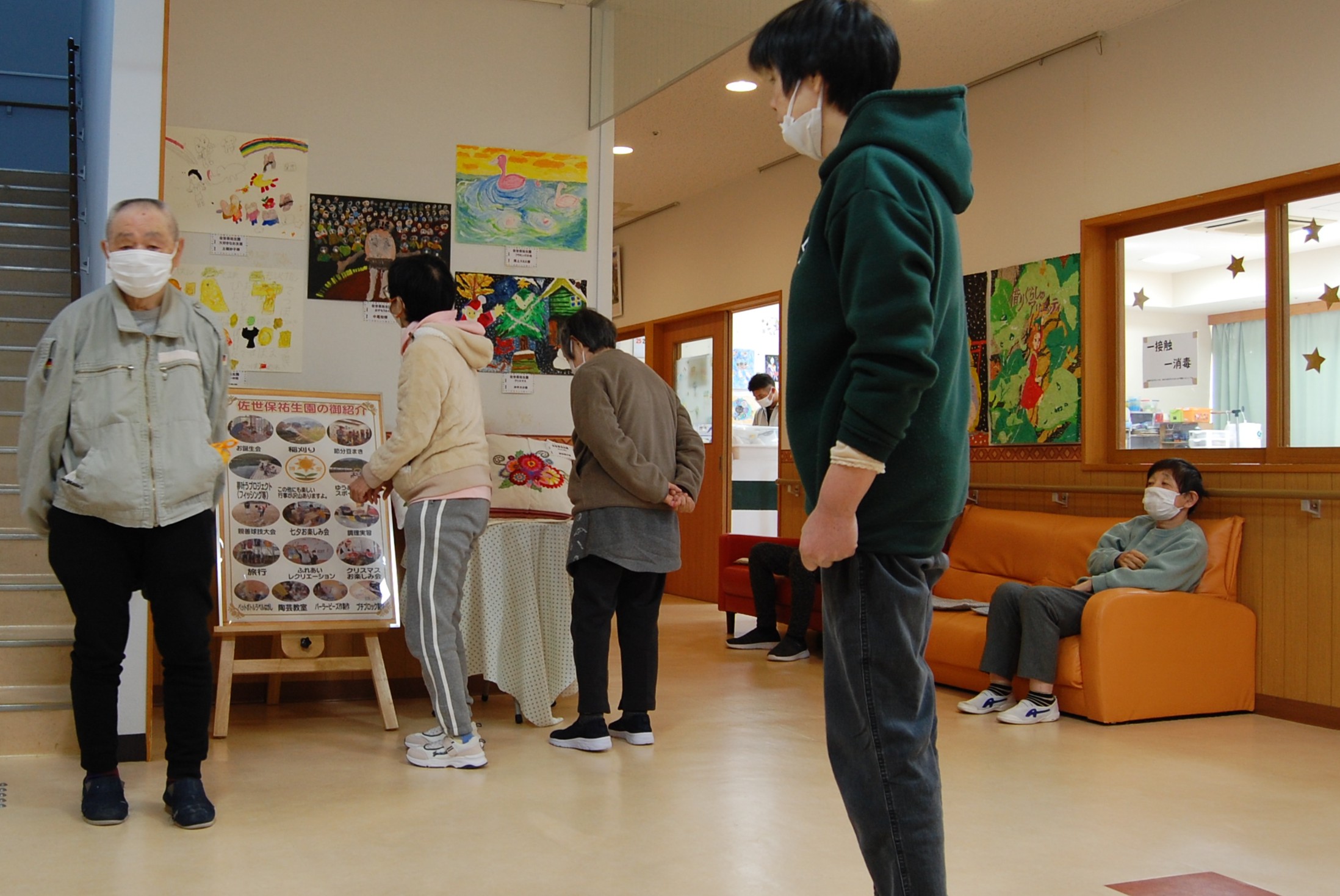 ホールをアートギャラリーに見立てて、いつも利用者様の貼り絵を中心に展示しています。「ふれあい作品展」に出した作品を新たに展示しました。美術教室で描かれた鮮やかな水彩画のほか、刺繍をほどこしたクッション、ビーズの工芸品、ガラスタイルのコースターなどです。