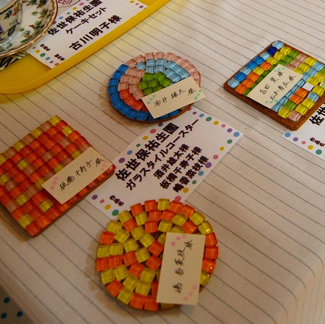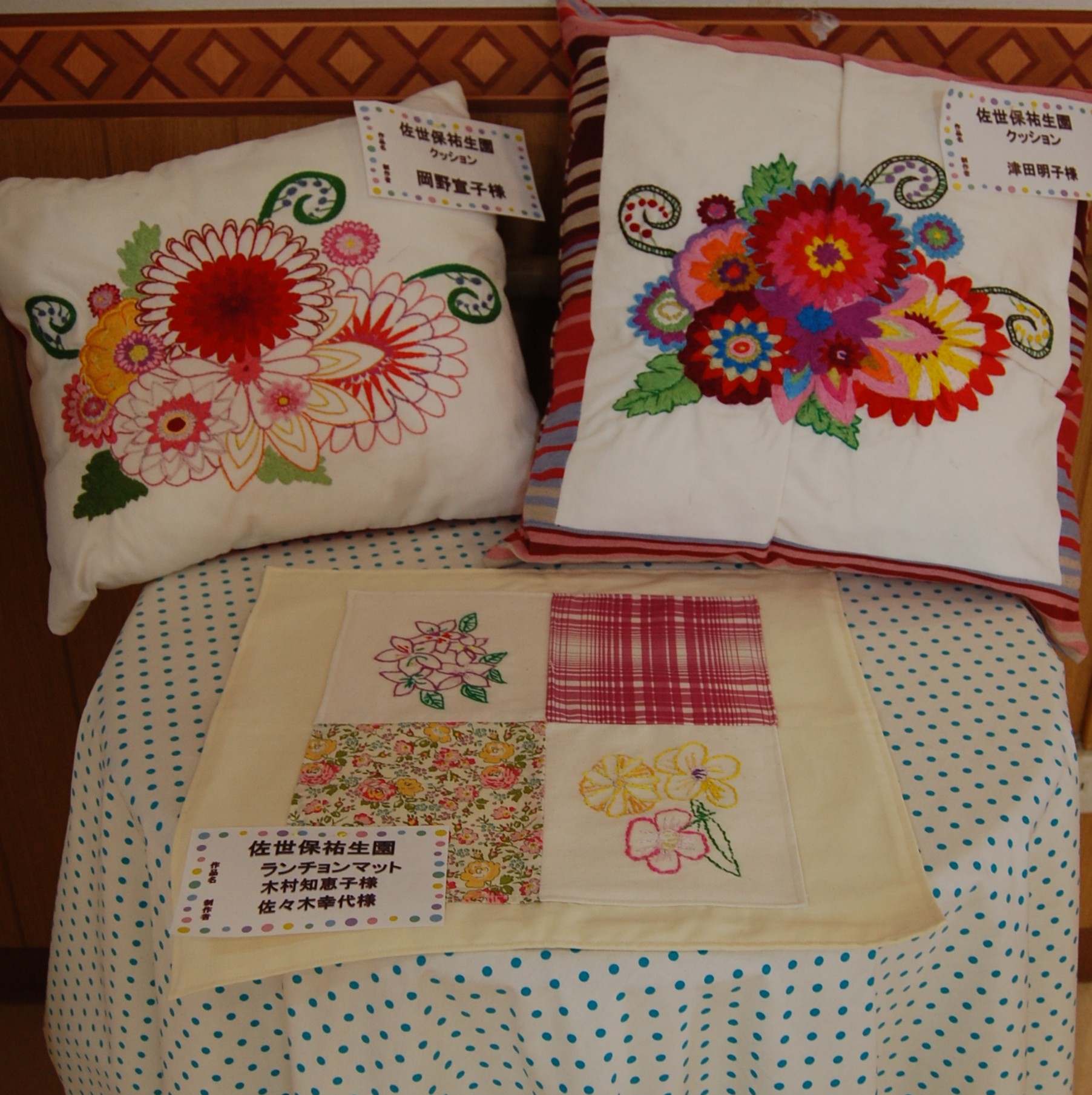 ホールをアートギャラリーに見立てて、いつも利用者様の貼り絵を中心に展示しています。「ふれあい作品展」に出した作品を新たに展示しました。美術教室で描かれた鮮やかな水彩画のほか、刺繍をほどこしたクッション、ビーズの工芸品、ガラスタイルのコースターなどです。