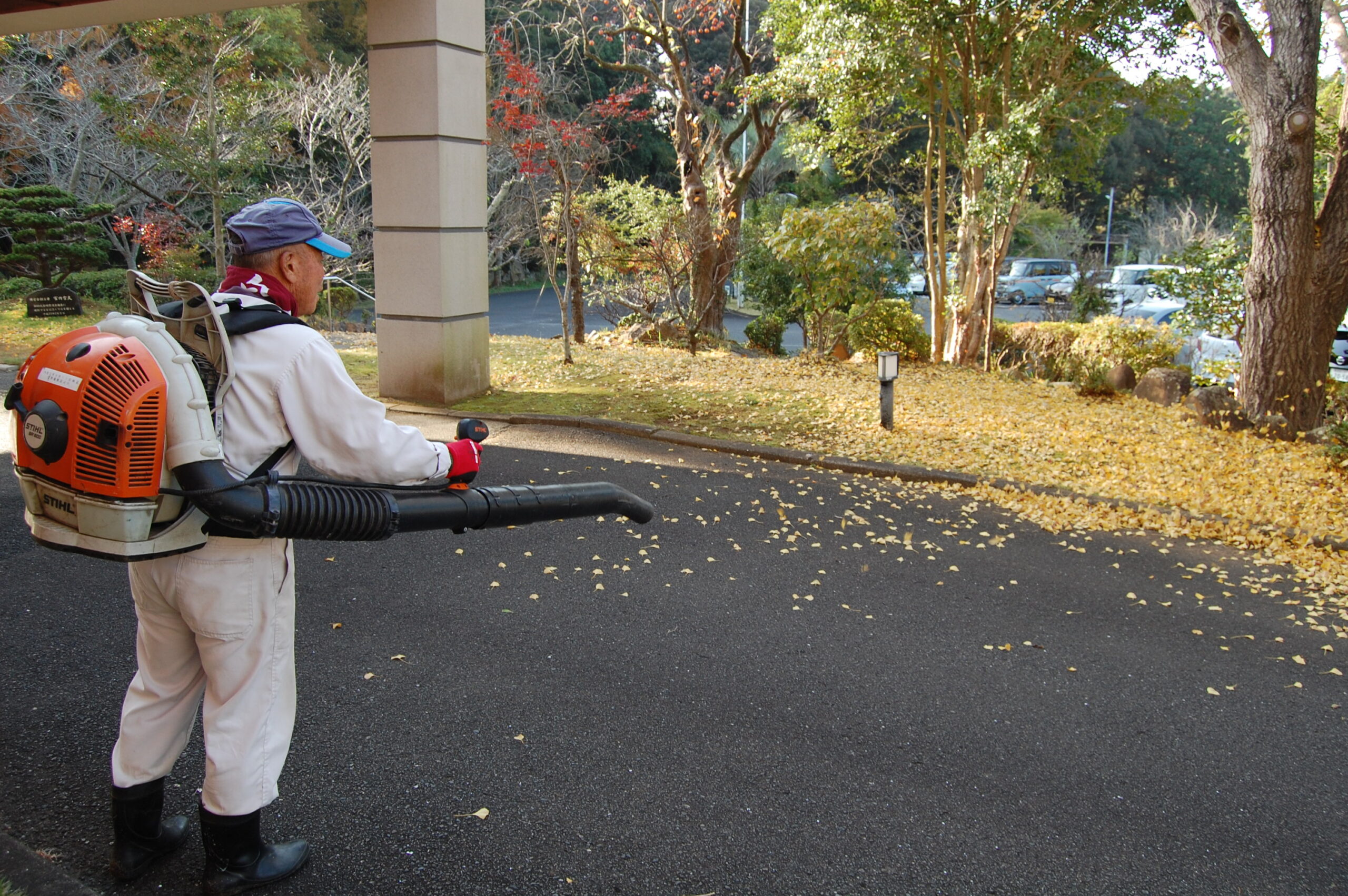 玄関前の車寄せに散り落ちた銀杏の葉を、村田支援員がブロワーで吹き飛ばしてきれいにしてくれました。この木は、もう三分の二くらいの葉が落ちました。