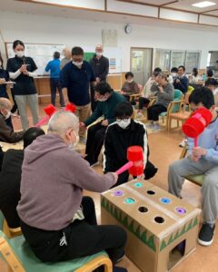 最終日には、学生の皆さんが企画・準備した「もぐらたたきゲーム」を実施。入所・通所の利用者様合同でレクリエーションを行い、会場は笑顔と歓声に包まれました。司会進行もしっかり務めて、実習期間での成長ぶりを見せていました。