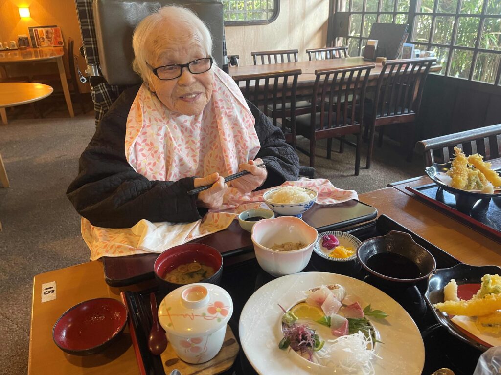 お刺身と天麩羅がセットになった御膳を前にすると、「美味か~、美味か~」と嬉しそうに声をあげられ、終始笑顔で召し上がられました。食事は15分ほどで完食され、その変わらぬ食欲に、ご家族様も大変喜ばれ、「この様子なら来年も元気に過ごせそうですね」と、ほっとされたご様子でした。