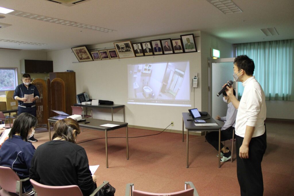 研修では、昨年導入した見守りカメラが捉えた「実際の転倒事故映像」を教材に活用。4つのグループに分かれ、当時の対応や再発防止策について多角的な視点から活発に議論を交わしました。