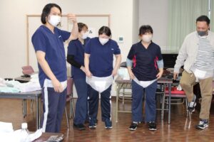 実技では、職員自身が実際にオムツを装着し、テープの位置の目安やあて方のポイントを体験しました。特に、ギャザーをしっかりと立てることで漏れを効果的に防げることを学び、日々のケアに活かせる実践的な技術を習得することができました。