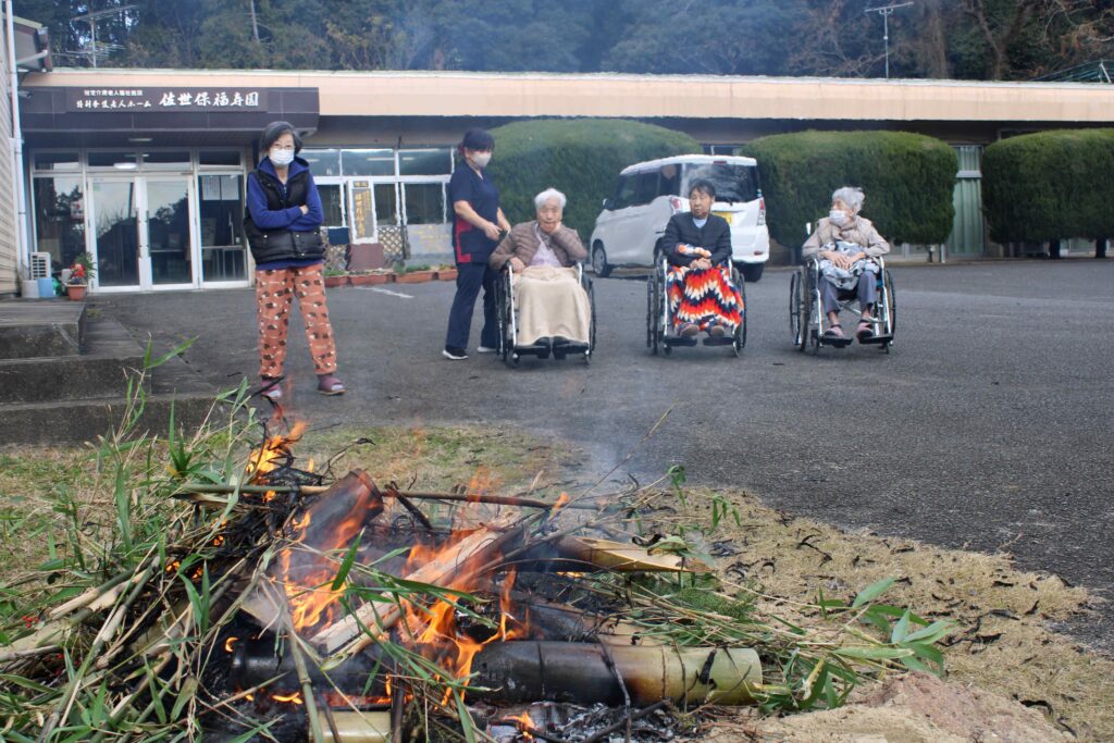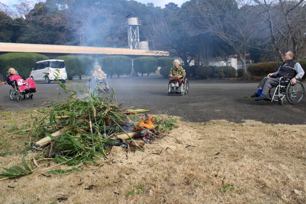 ちょうど鬼火焚きの時間帯に面会に来られたご家族もおられ、入所者様と一緒に煙を浴びながら、「お母さん、元気でいてくださいね」と健康を祈願される姿が見られました。
