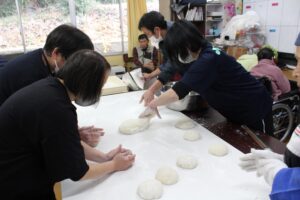 次に、利用者様の皆さんが交代で餅つきを行いました今年も利用者様のトップバッターは、最高齢の(93歳)男性利用者様にしていただきました😊利用者様、職員の「よいしょ」「よいしょ」の声に合わせて杵を何度も何度も振り下ろされていましたその力強さは今年も健在でした。他の利用者様の皆さんも、とても嬉しそうな顔をされ満足した様子でした。つきあがった餅は、職員が形を整え鏡餅にしました。新しい年を迎える準備が出来ました。来年も利用者様に楽しんでいただける行事を大切にしてまいります。