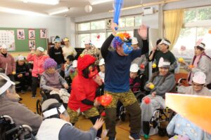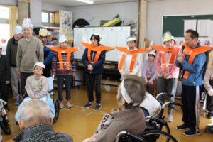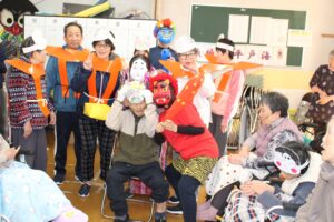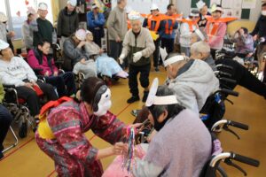 今年、年女を迎えられた女性の利用者様3名と古希を迎えられた女性利用者様1名が手作りの裃をまとって今年の福をつとめました。利用者様の皆さんは節分の日に向けて共同制作で赤鬼、青鬼の壁面と「今年もみんながケガ、病気をしませんように」と願いを込めて、お多福、鬼のお面を作りました。👹