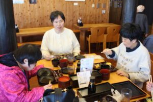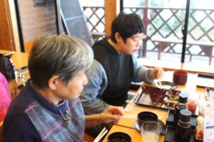 次の目的地、西海市にある海の駅「船番所」へ到着まで車内ではシルエットクイズで大盛り上がり 普段控えめな利用者様が何度も挙手して答えて下さる場面があり、職員もビックリ新しい発見でとても嬉しい瞬間でした😊いよいよ、海の駅「船番所」に到着。大村湾入り口の海を眺めながら、握り寿司🍣を注文されたり、好きなスイーツ🍰を見つけみなさんお腹いっぱい、笑顔いっぱいでランチバイキングを楽しんでいただきました。帰りの車内はお腹いっぱいで満足されたのか心地いい寝息が聞こえてきました。今日はとても楽しい日帰り旅行となりました🚌