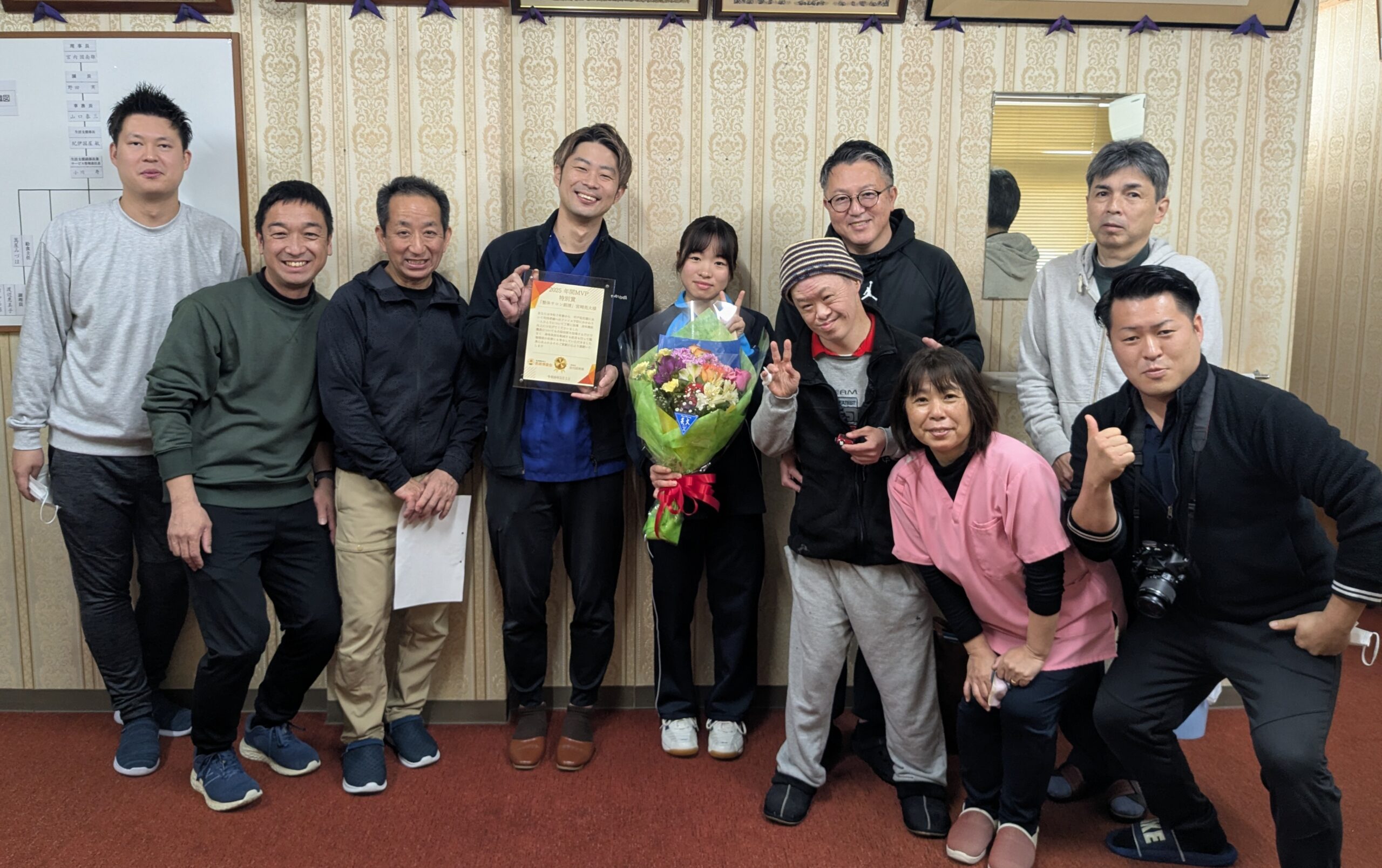 長崎博愛会は、佐賀県嬉野市にある「整体サロン創清」代表の宮﨑亮太様に、「2025 年間MVP特別賞」を贈りました。理学療法士の宮﨑様は昨年4月から月1回、平戸祐生園でフレイル予防の活動に取り組んでいただいています。19日、平戸祐生園で表彰しました。日ごろのご指導に深く感謝いたします。