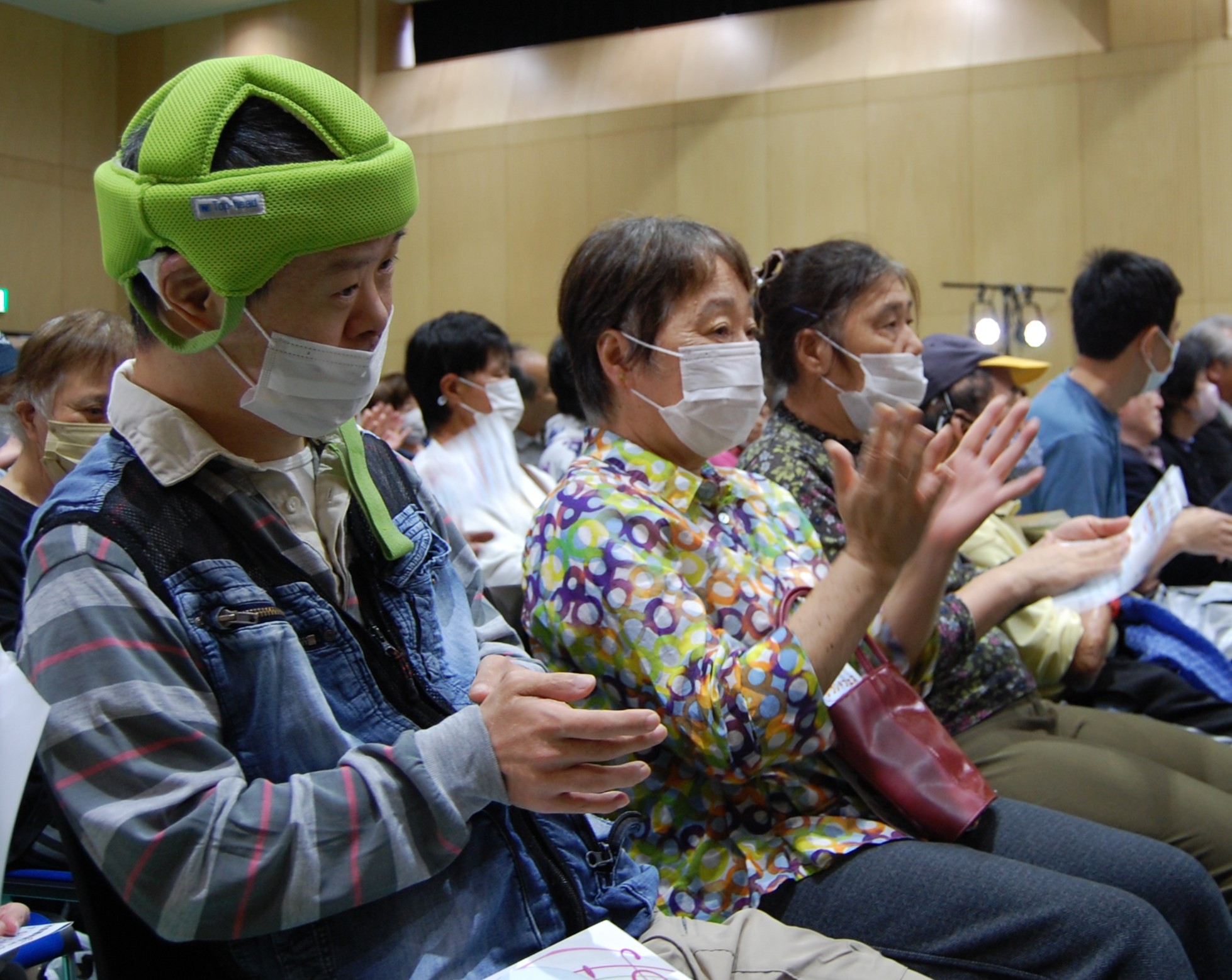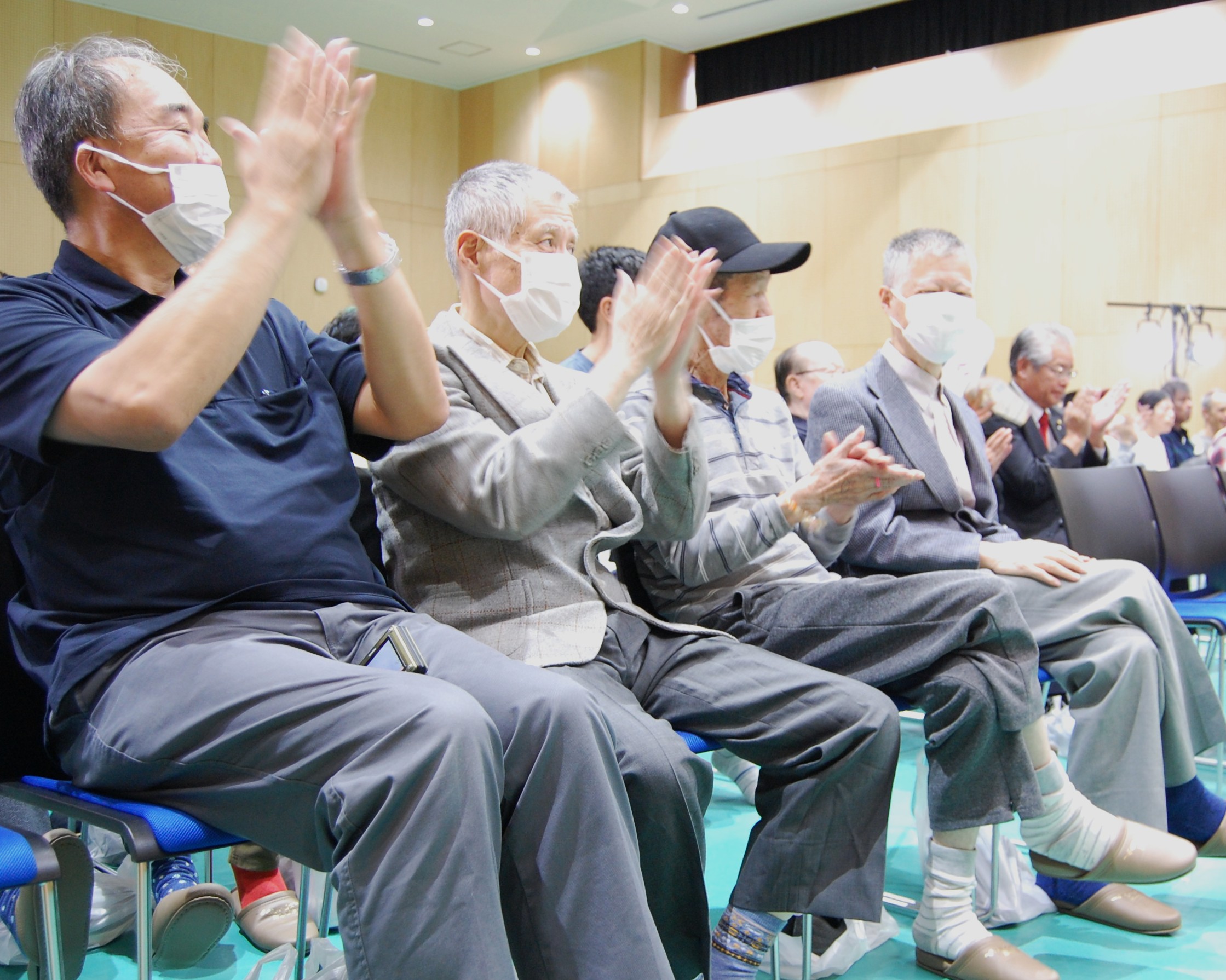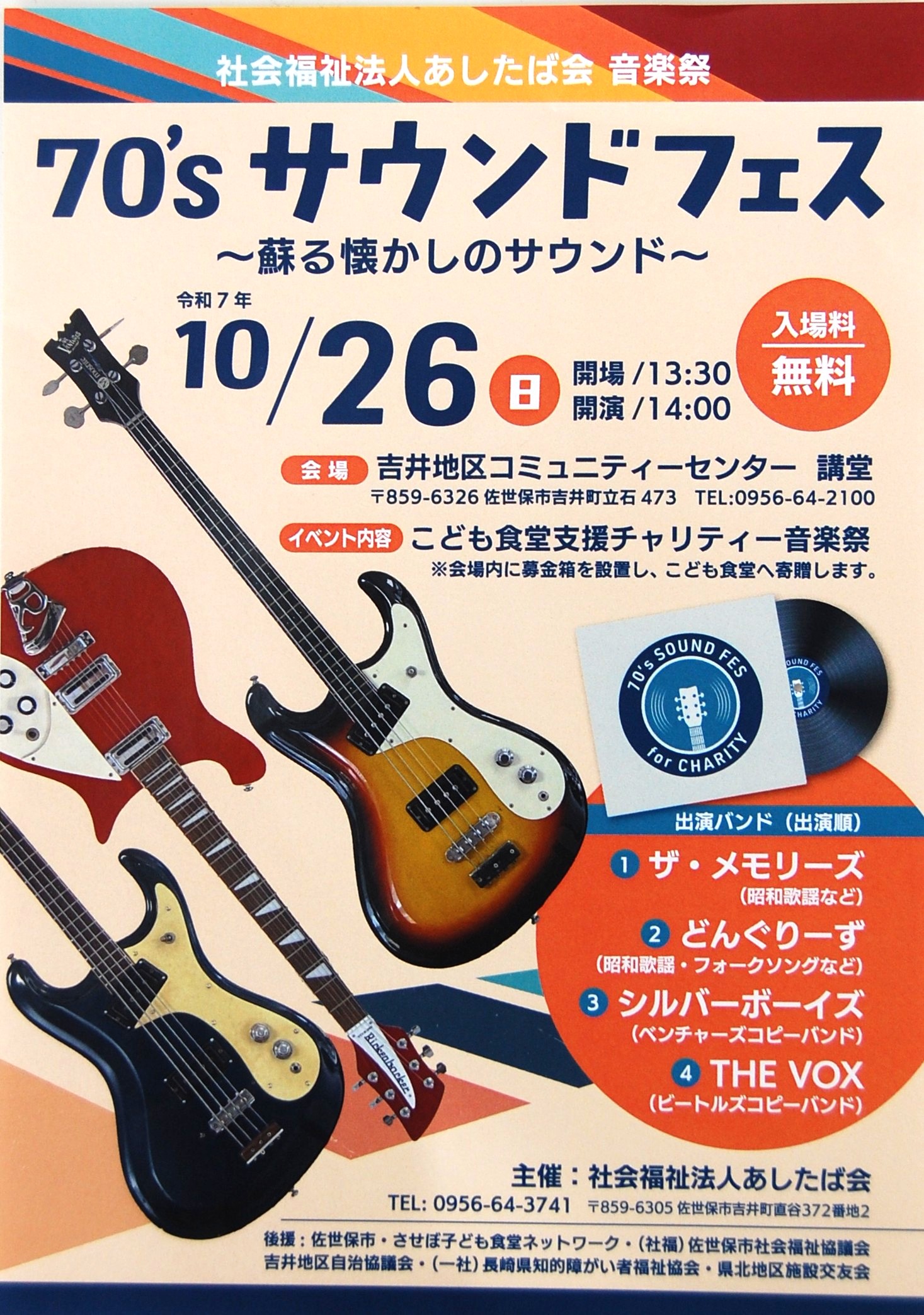 「70’S サウンドフェス~蘇る懐かしのサウンド」と題したイベントには、佐世保を中心に活動するバンドなど四つのグループが出演。会場となった吉井地区コミュニティセンターの講堂に演奏を響かせました。演奏を楽しんだのは、招待された福祉施設の利用者様や職員の皆さん約200人。参加した利用者様は手拍子を取ったり、体を揺らしたり。巨大なスピーカーを通して響く楽器の音と歌声に「感激して涙が出たよ」「とっても楽しかった」と話していました。
