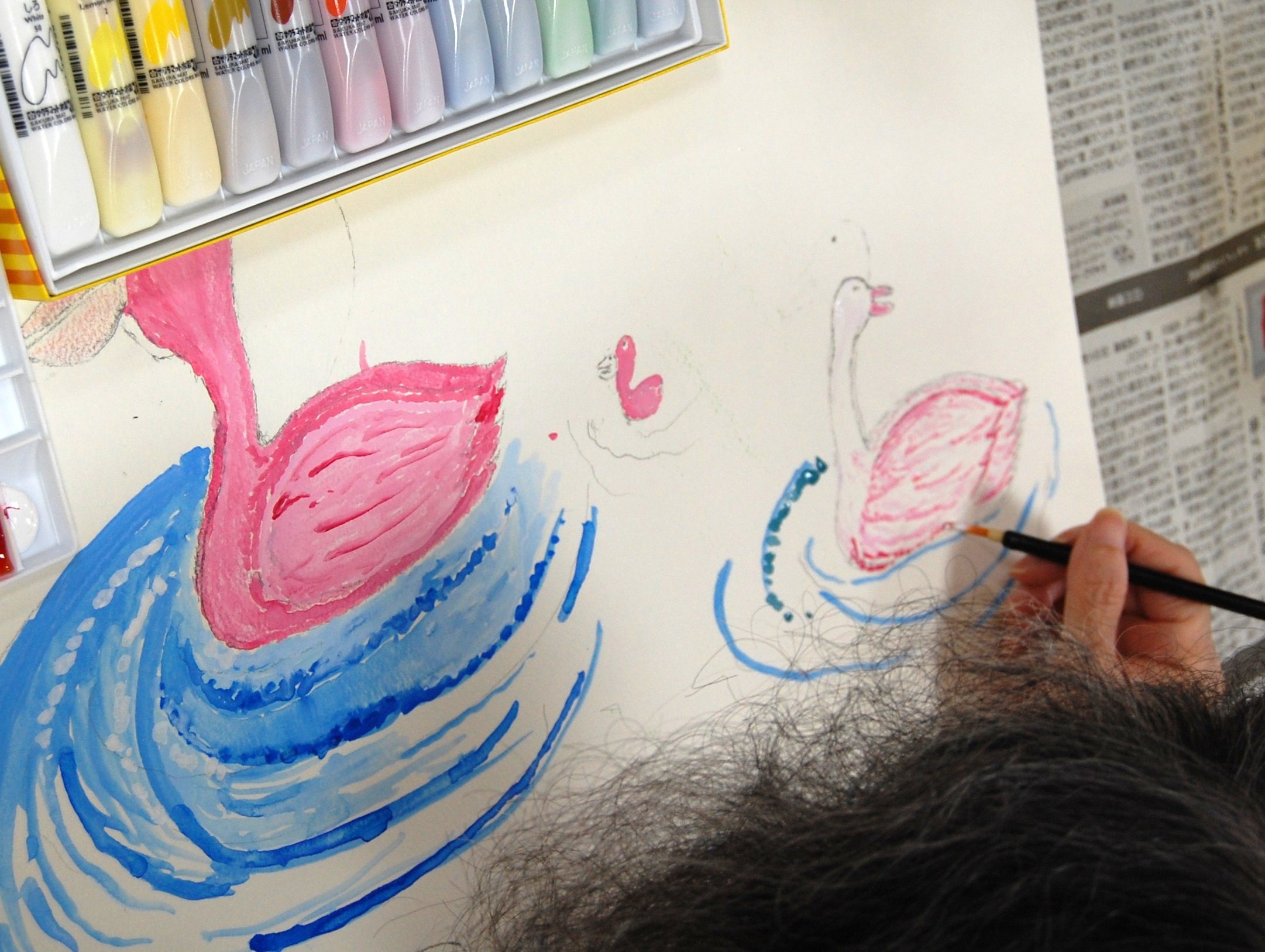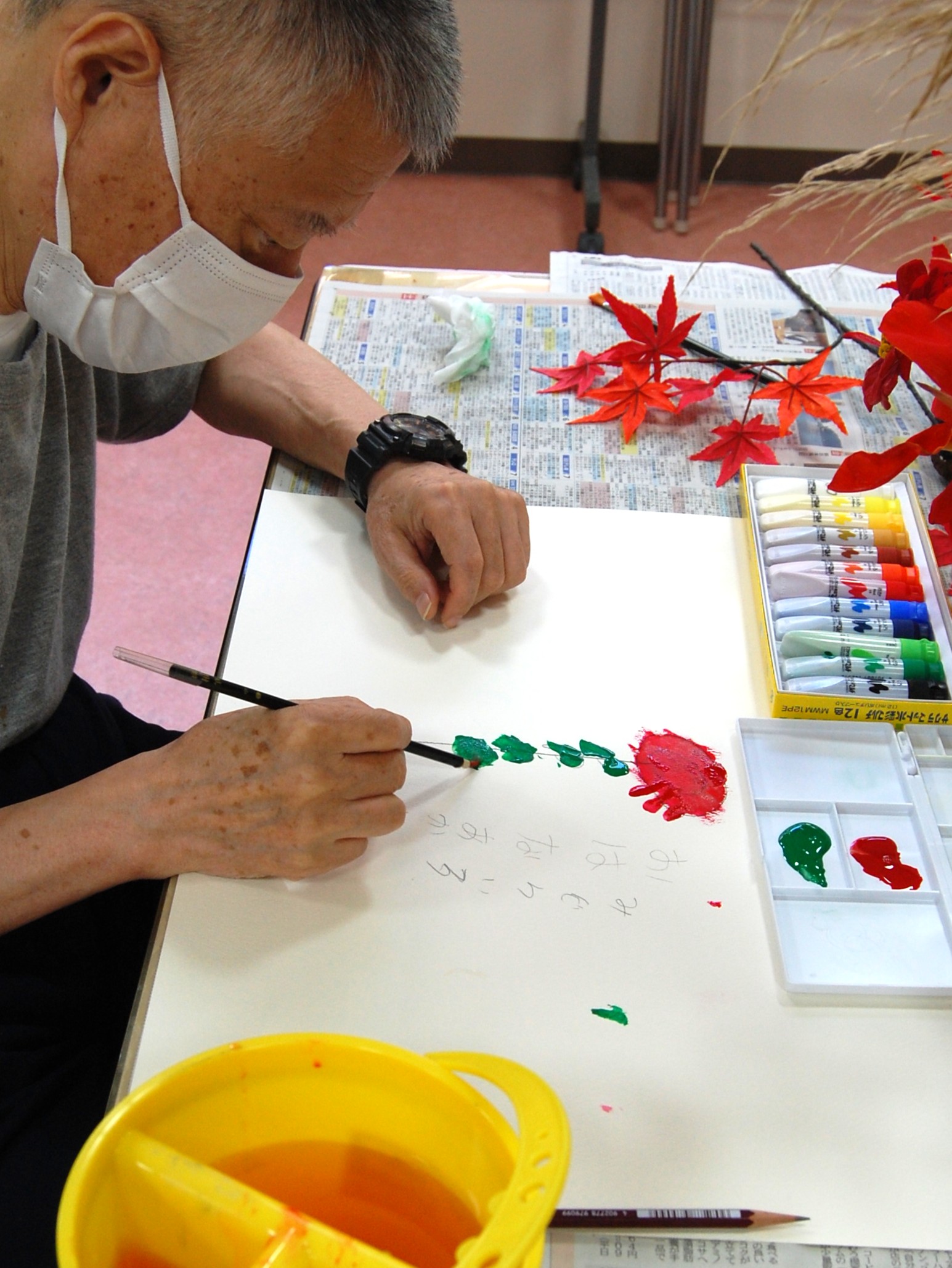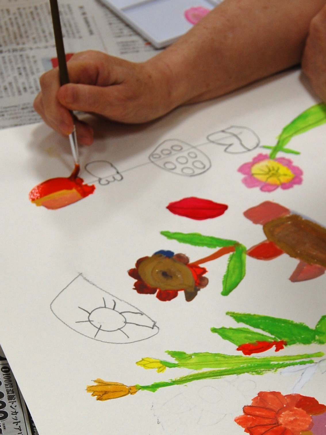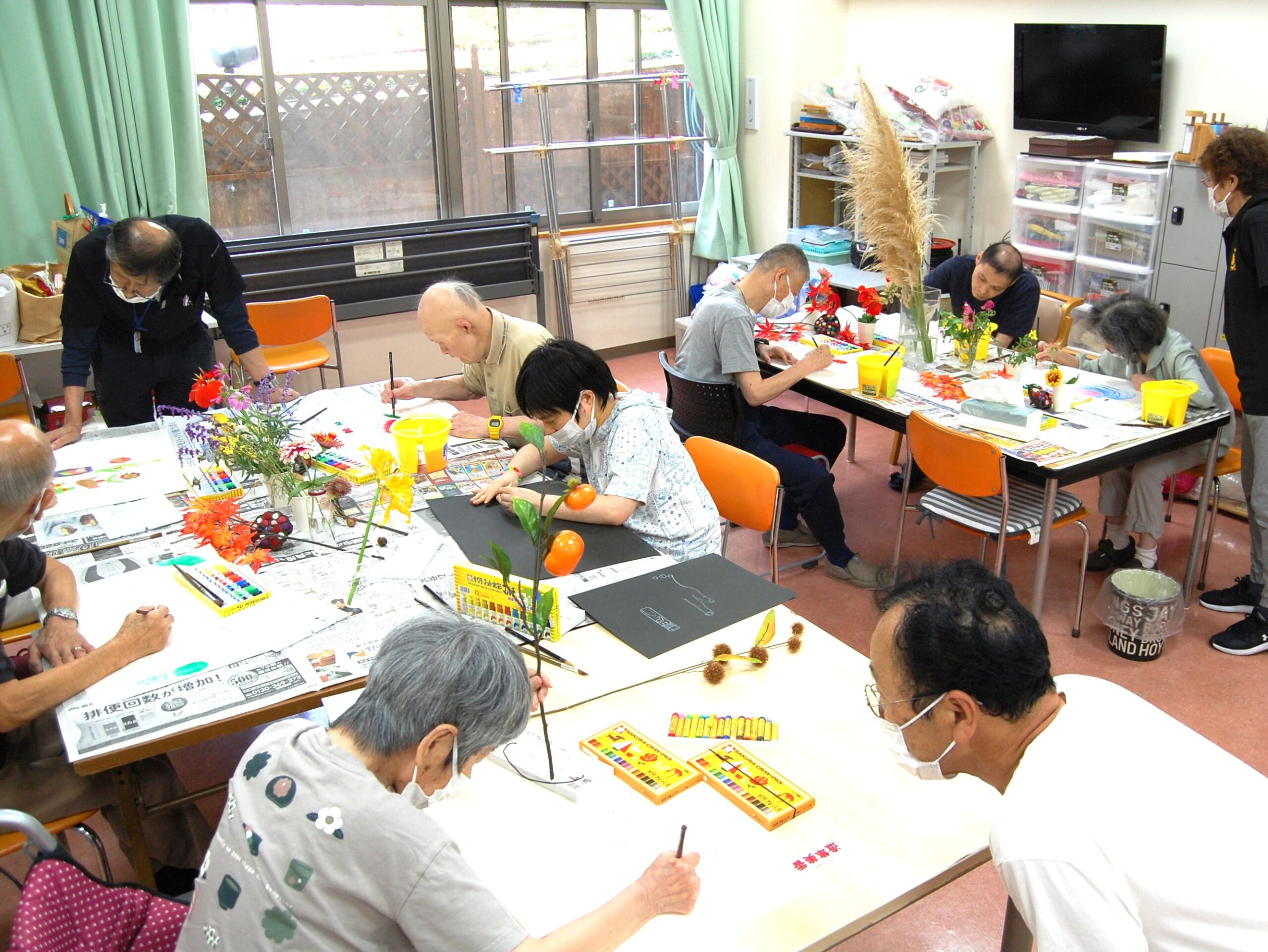 美術の教室が8日に開かれました。この日は、8人の利用者様が参加しました。生花を模写したり、風景や動物を自由に表現したり。皆さんは集中して絵筆を動かしていました。