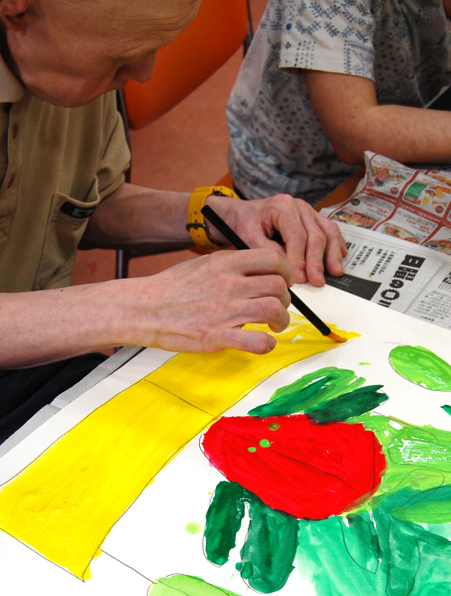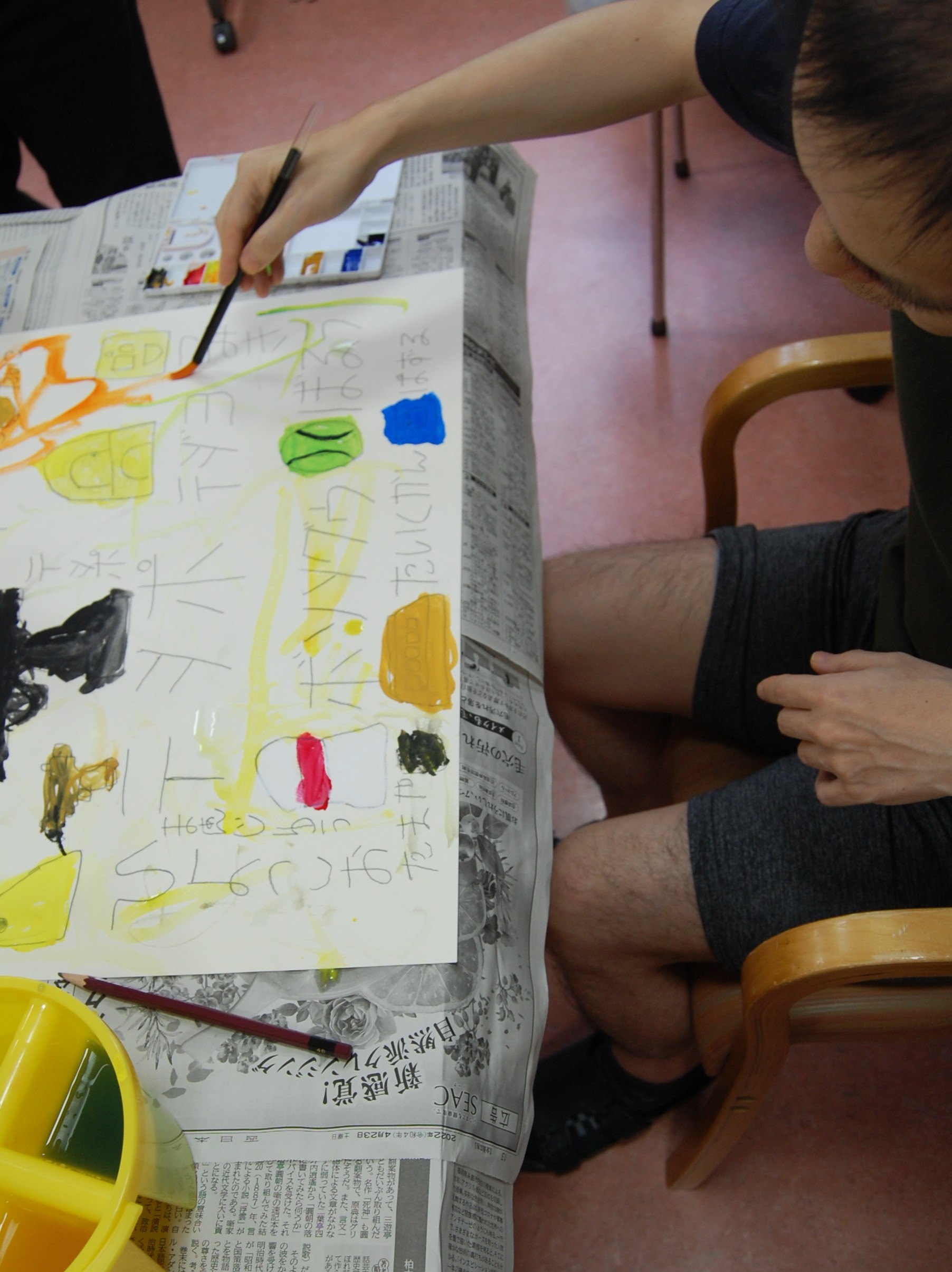 前回、1色だけで描いた利用者様は今回、3色を塗り分けて仕上げました。文字を書くのが好きな利用者様は、文字のまわりにさまざまな色をほどこして鮮やかに表現。「ちょっと変化が出てきましたね」と講師の出口知利先生。色を混ぜ合わせて別の色を作れるようになったのを見て、「皆さん、覚えが早いです」と話しました。