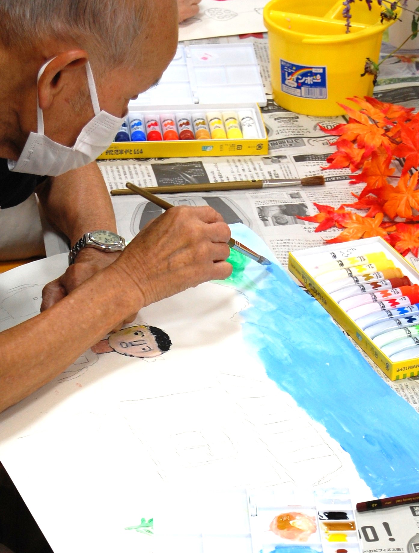 画用紙の裏に、氏名と学校名を書く欄があります。一人の利用者様はそこに自身の氏名だけでなく、出身小学校の名前もサラサラと記入しました。まるで書くのが当たり前のように。「ああ、あの小学校だったのねえ」と私たちスタッフたちはみな笑顔に。スタッフも毎回、新たな発見があります。