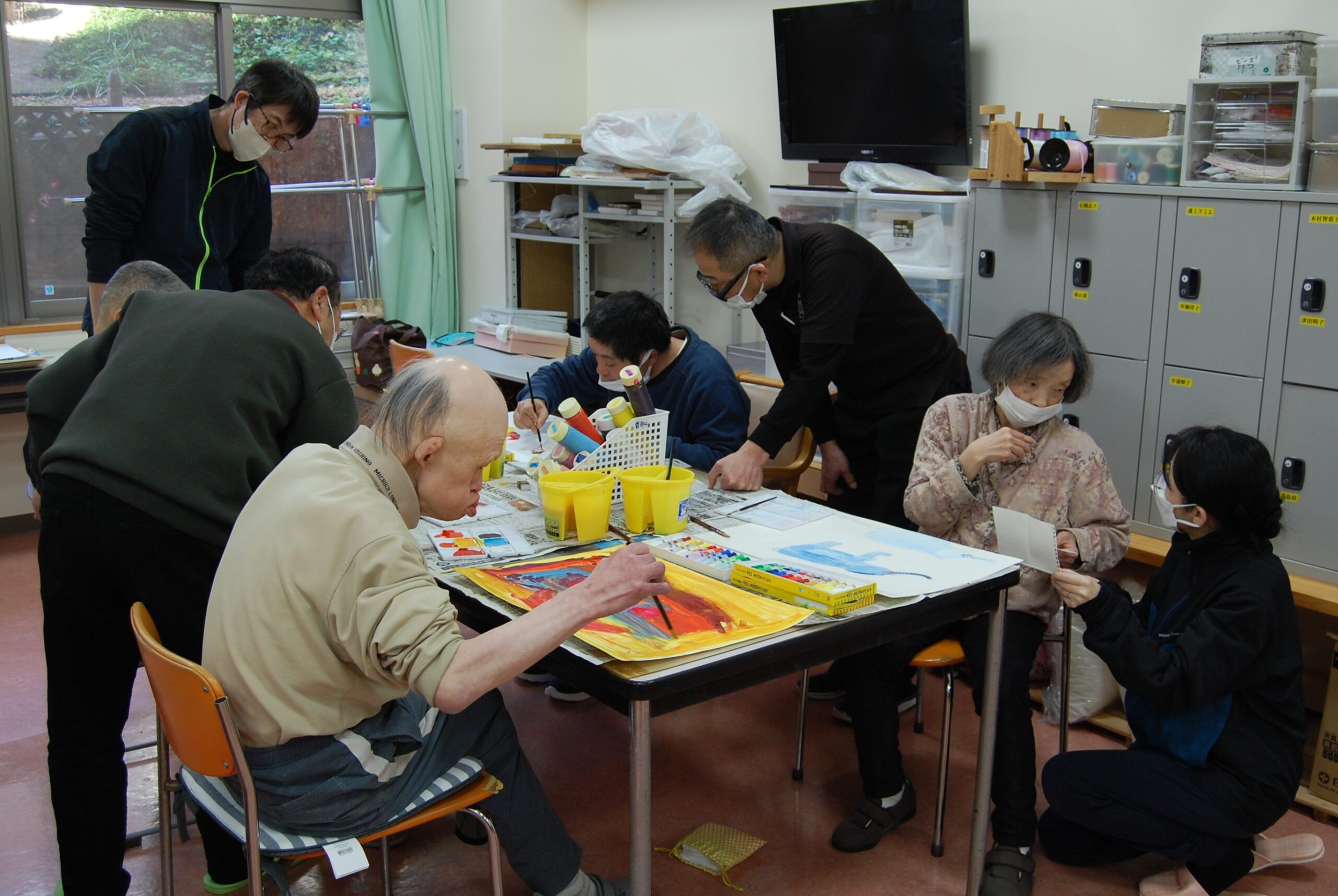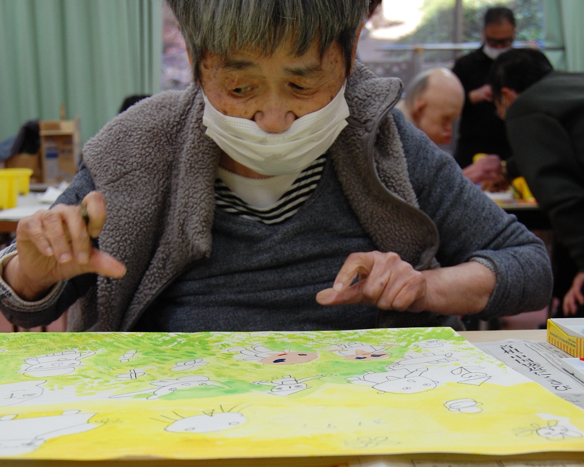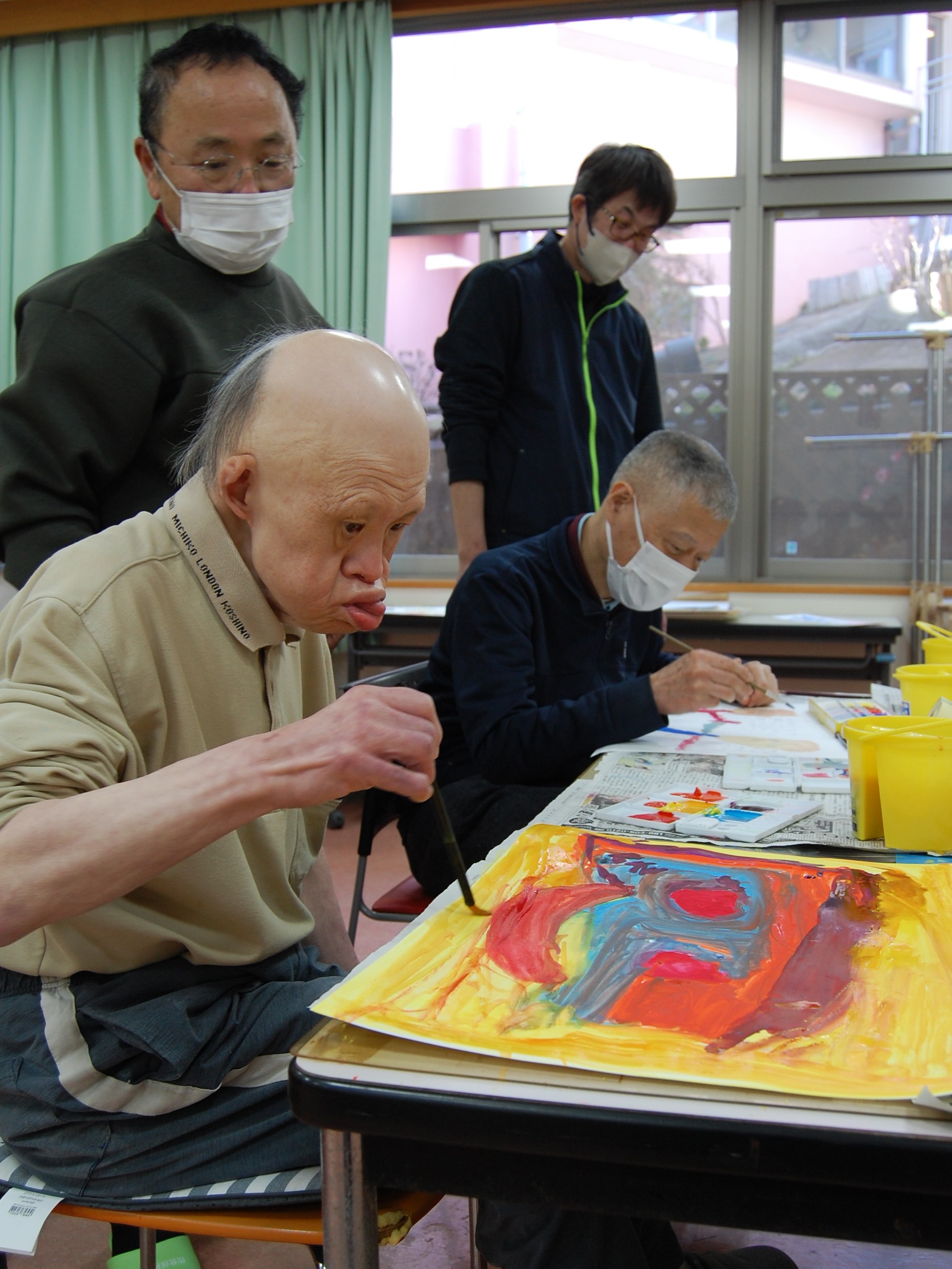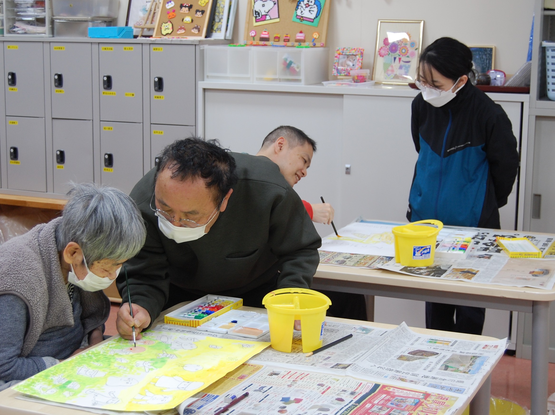 久しぶりに入ったあるスタッフは「色使いが前よりも上手になっている!」と驚いていました。この日は、出口先生の娘さんも来てくださり、利用者様と話しながら丁寧に指導していただきました。ありがとうございました。