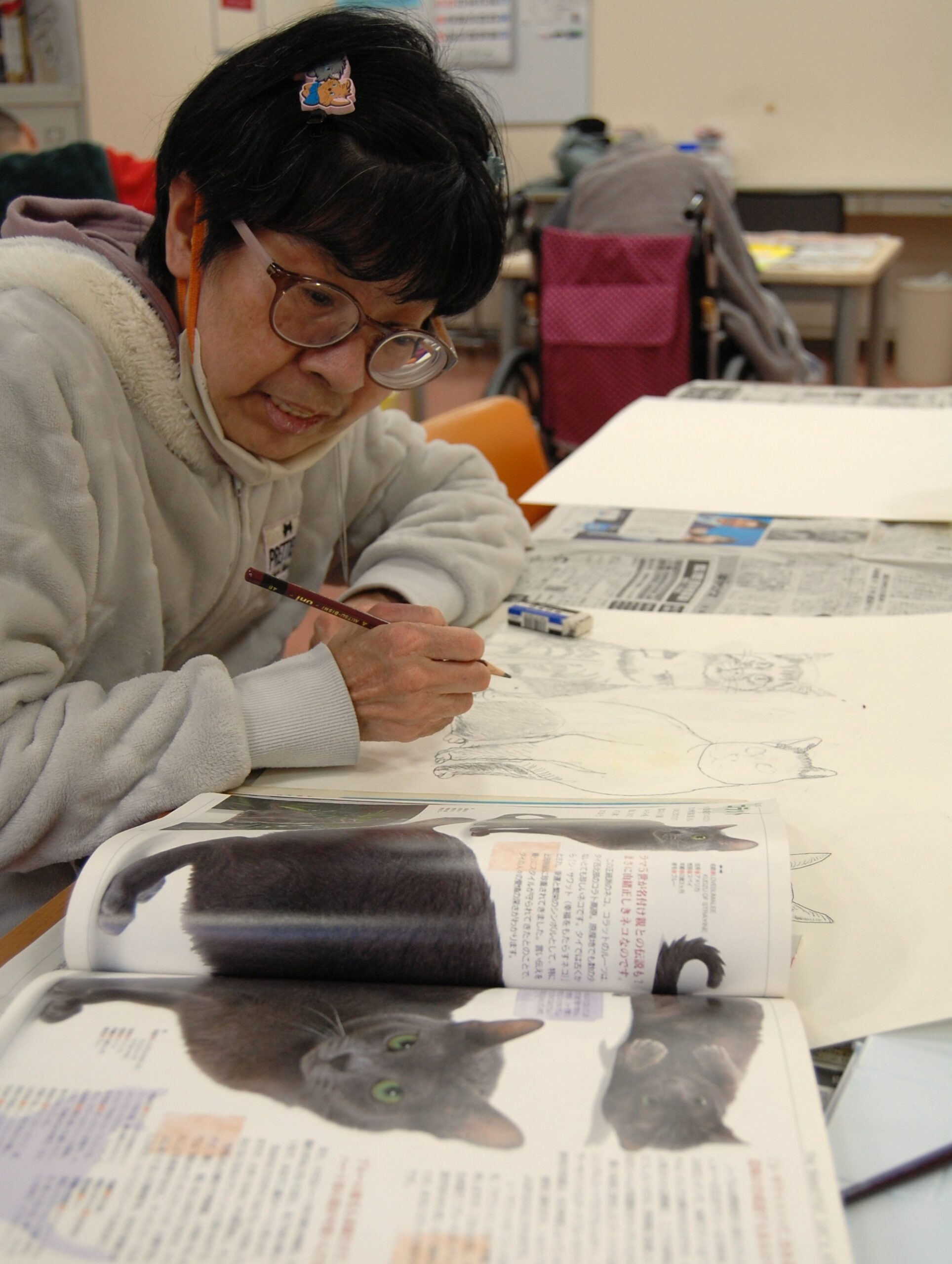 美術の教室が28日にあり、9人の利用者様が参加しました。猫の写真を模写したり、風景を描いたり。ある人は絵具で、ある人は鉛筆やクレヨンを使って、思い思いに表現を楽しんでいました。