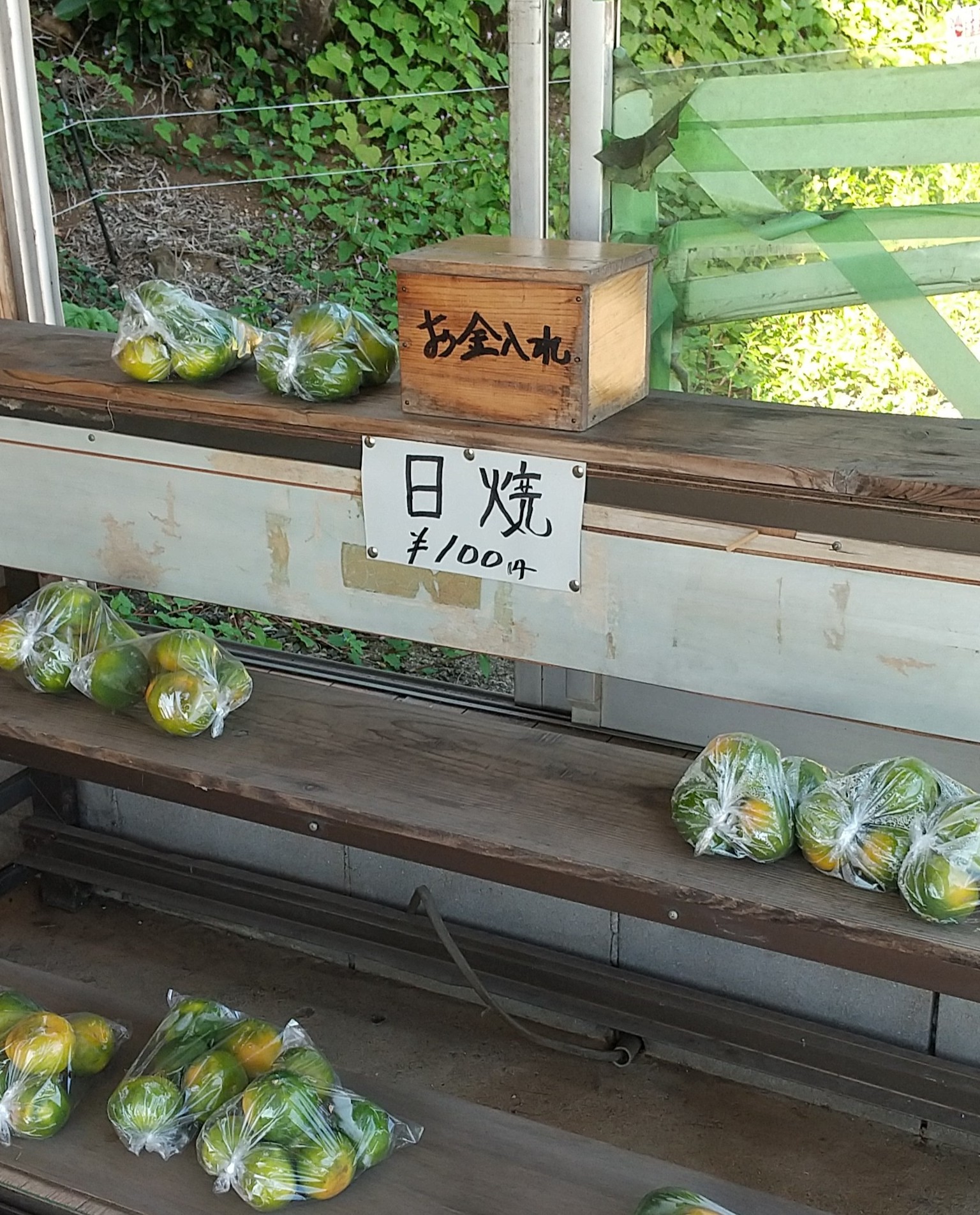 長崎博愛会から西海橋方向に車で約5分、国道202号線沿いの小さな建物。みかんの季節にだけ開く無人販売所なんです。今年は9月末にオープンしました。「日焼」と書かれた紙があり、みかんが数個ずつビニール袋に入れられています。お値段は、5個入りがなんと100円。