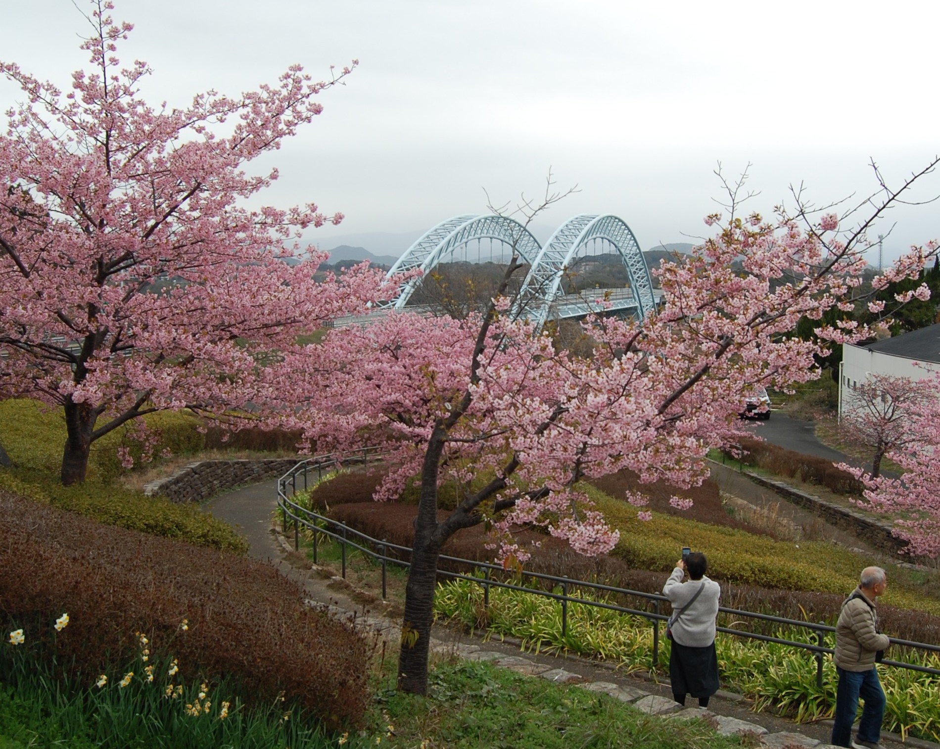 訪れた人たちは遊歩道をゆっくりと歩きながら景色を楽しんでいました。24日午後は小雨がぱらつきました。今週末までお花見が楽しめるといいですね。
